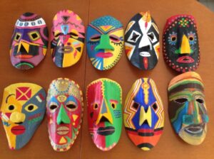 Máscaras de inspiração indígena, africana e carnavalesca