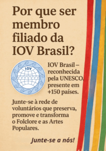 A IOV — International Organization of Folk Art, parceira oficial da UNESCO, é a maior organização de folclore do mundo, presente em dezenas de países e atuante na salvaguarda, valorização e difusão das culturas tradicionais. Ao filiar-se à IOV Brasil, o membro passa a integrar essa grande ciranda internacional de povos, linguagens, ritmos, danças, rituais e expressões identitárias.
