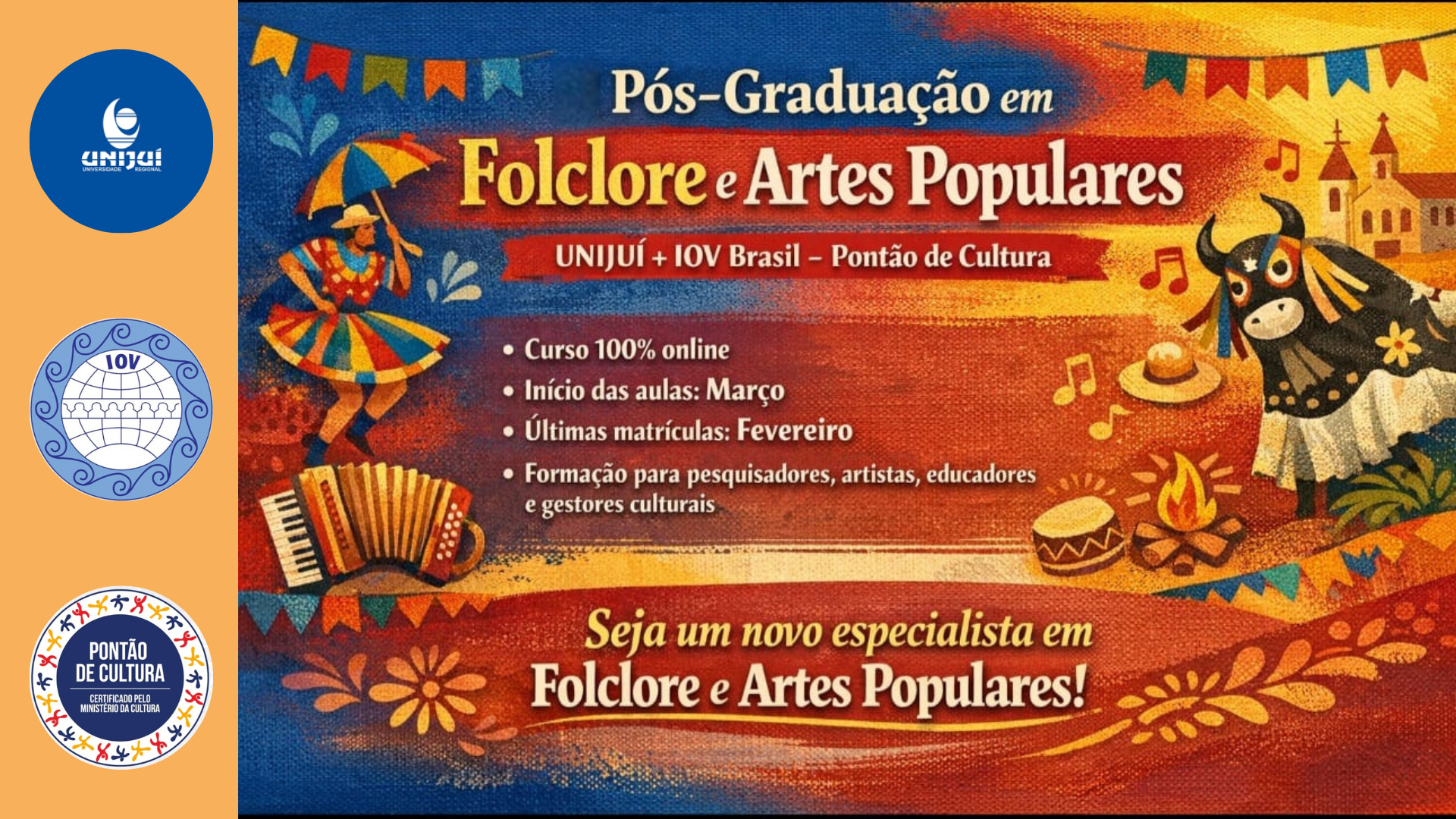 A II Edição do Curso de Pós-Graduação em Folclore e Artes Populares, promovida pela UNIJUÍ, em parceria com a IOV Brasil – Pontão de Cultura, representa um marco fundamental para o fortalecimento do campo do folclore, das artes populares e da cultura tradicional brasileira no âmbito acadêmico e institucional.